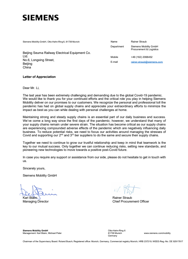 北京森瑪鐵路電氣設備有限公司成立于2007年6月,注冊資金330萬美元,是一家生產鐵路電氣化設備的德國獨資企業,擁有獨立的進出口經營權。公司占地面積6000㎡,辦公及生產面積3000㎡。2008年5月公司通過德國萊曼博士認證機構DIN EN ISO9001:2000認證。2011年1月通過ISO9001質量管理體系認證,于2018年11月成為北京市高新技術企業。